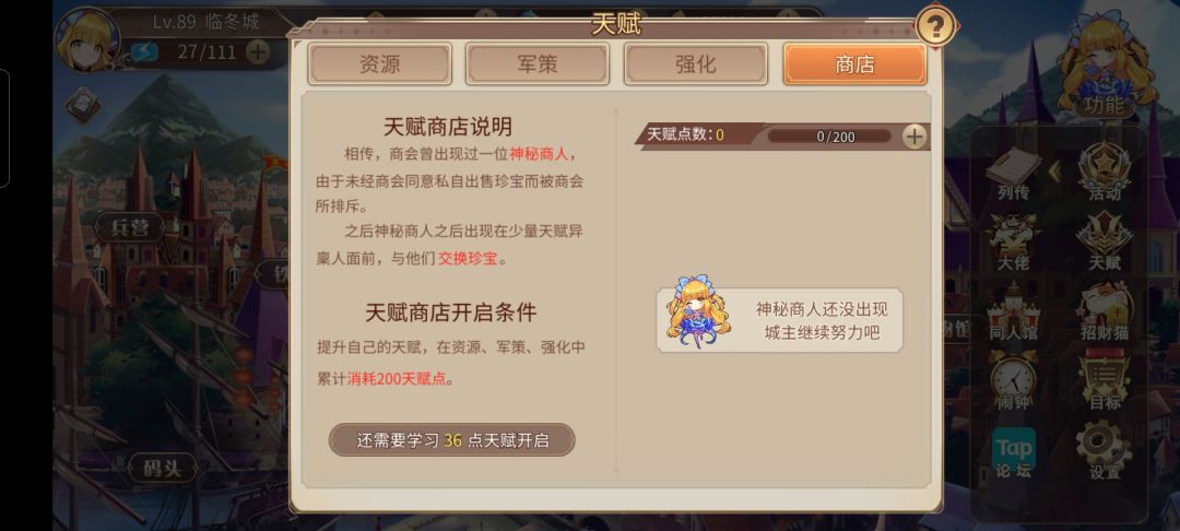 加点顺序总结:精兵强军蓄税轮流点到三级→贸易专精→精兵强军蓄税轮流点到五级→贸易→灵喵降临(→远航探索军备按需点)→精兵强军轮流点到八级→精武按需点→精兵强军点满→按需点强化