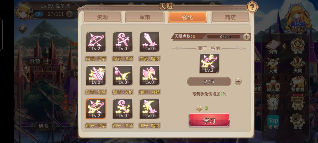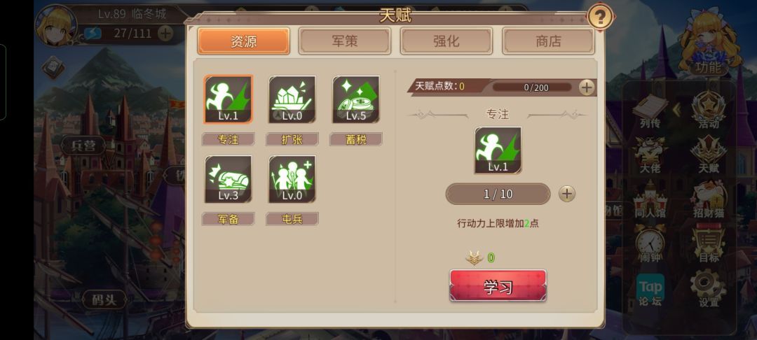 强军:必点天赋,1级强军是所有人第一个应该点的东西。跟精兵轮着来就行了,推荐点满。但是五级以后成本比较高,可以把急缺的天赋点完了再补。