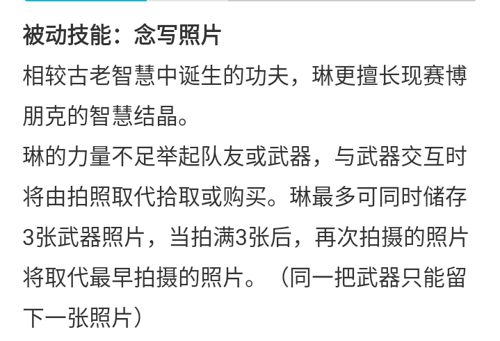 看见没,拍照代替拾取或购买,就是没钱也能嫖商店,什么强大武器我买不起,但我拍个照留念可以吧。但是也有劣势之处,拿了琳你就无法通过商店套口红检索特定武器了,因为你买不了。
