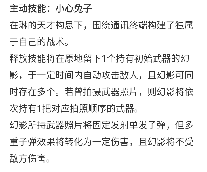 实战体验后发现,这个角色很吃运气,如果没拍到好的武器的话,那你好几个幻影可能输出都不如你的初始武器纸鸢(这里也顺便提一下,琳不是不能开枪,只是初始携带武器不能换,实际体验后我发现,纸鸢这把枪也是蛮不错的)