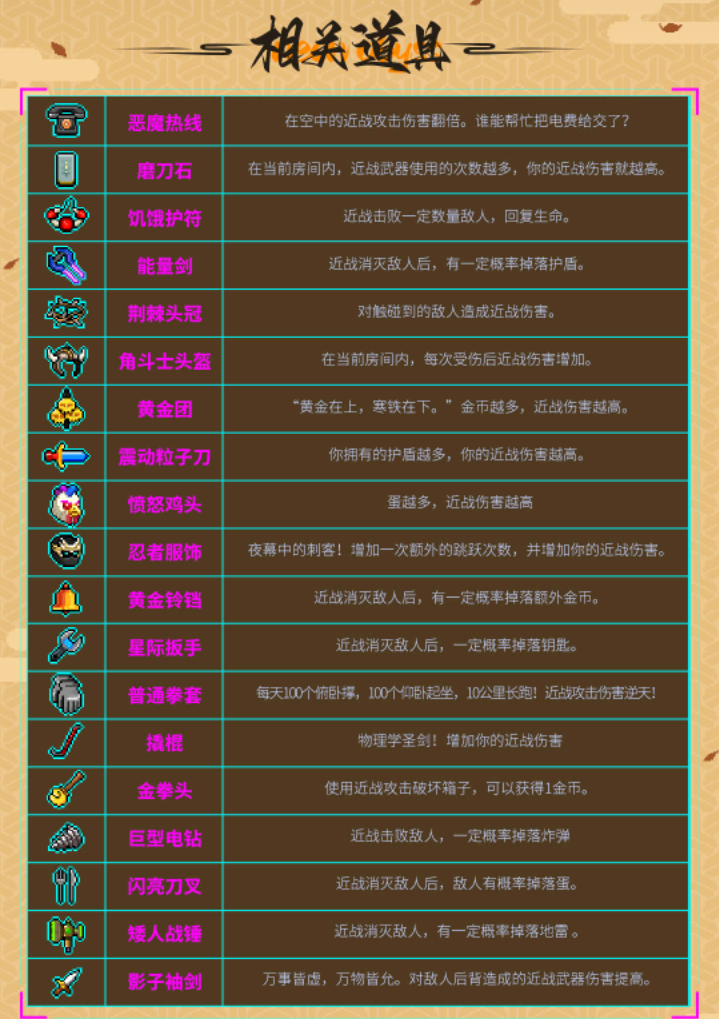 可以看见,近战套装的大部分道具,都是我们在深渊中很容易见到的,这就提供了便利。再加上要什么来什么定则,想凑满也不难。所以如果想玩的话,我推荐,不用特意带相关纪念品(磨刀石恶魔热线还是要的,哈哈哈),在深渊随缘凑套装就好了。
