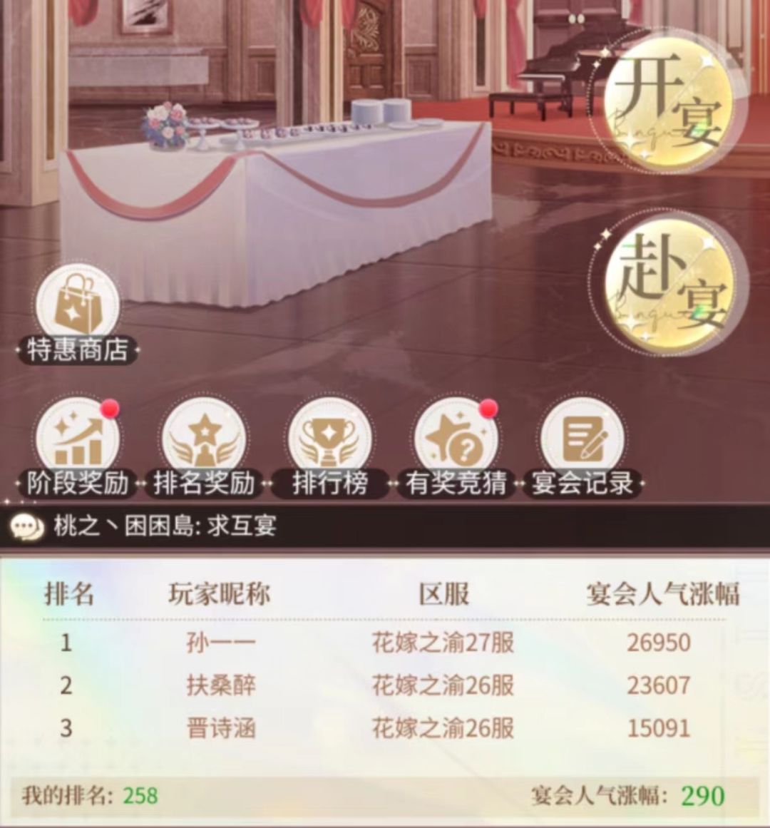 2.玩法:在活动开启时所有参赛服的玩家都可以通过提升人气属性来参与活动。只要在活动期间我们进行了人气属性提升,系统会自动给我们计算在活动期间,等到活动结束时,系统会根据我们在活动期间参与宴会所提升的人气属性提升值,进行排行榜排名。