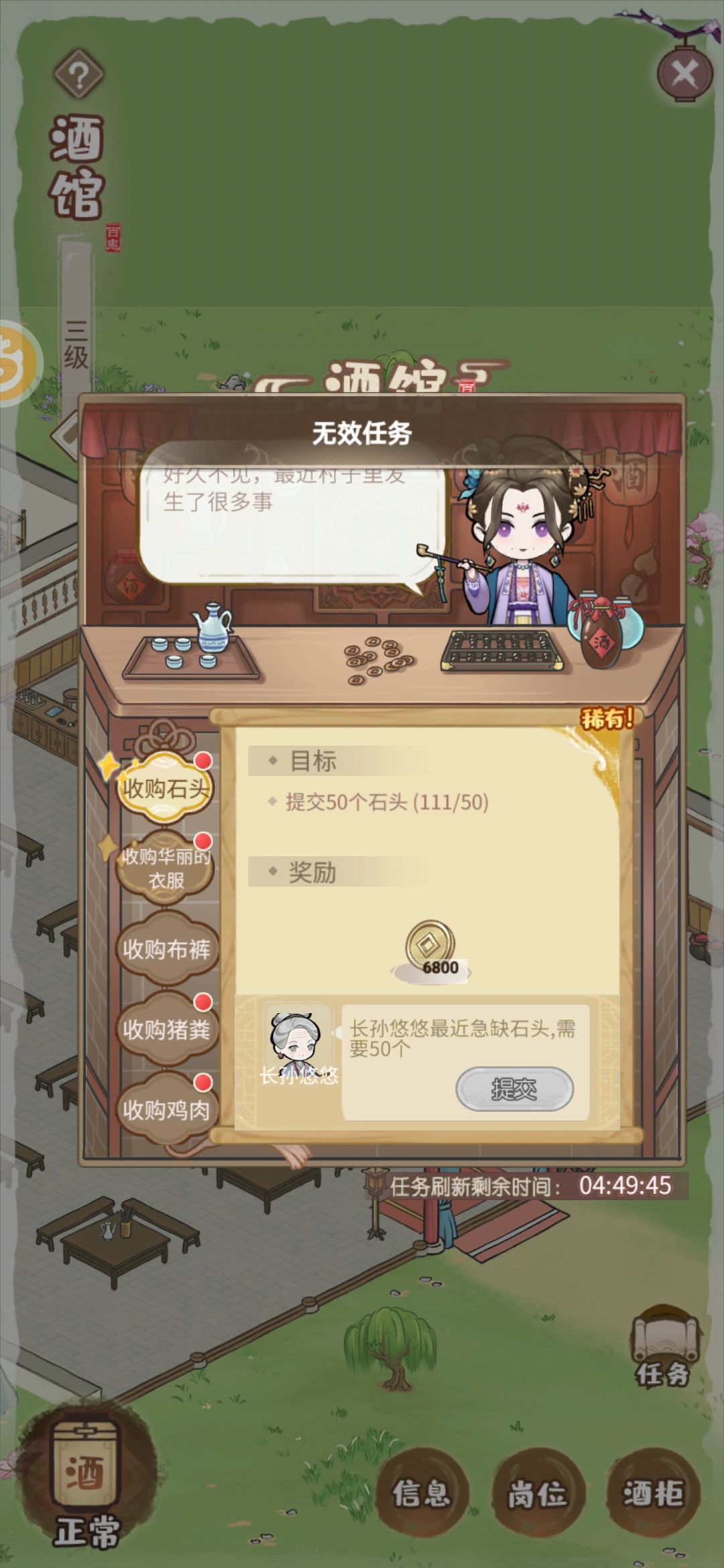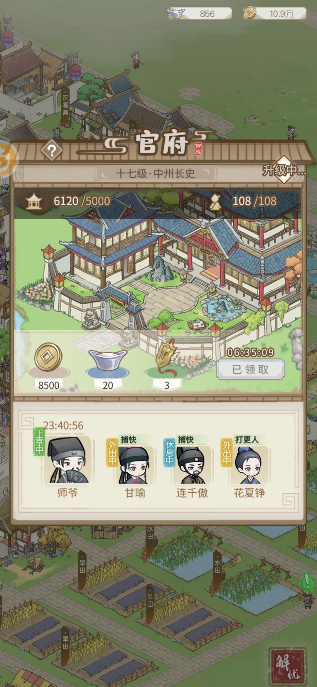 ps:关于收益问题石头真的很坑,一天也就收了不够100个,升级还要官府等级,官府升级时间操作过长,等几天才升一级,这样真的烦烦烦。