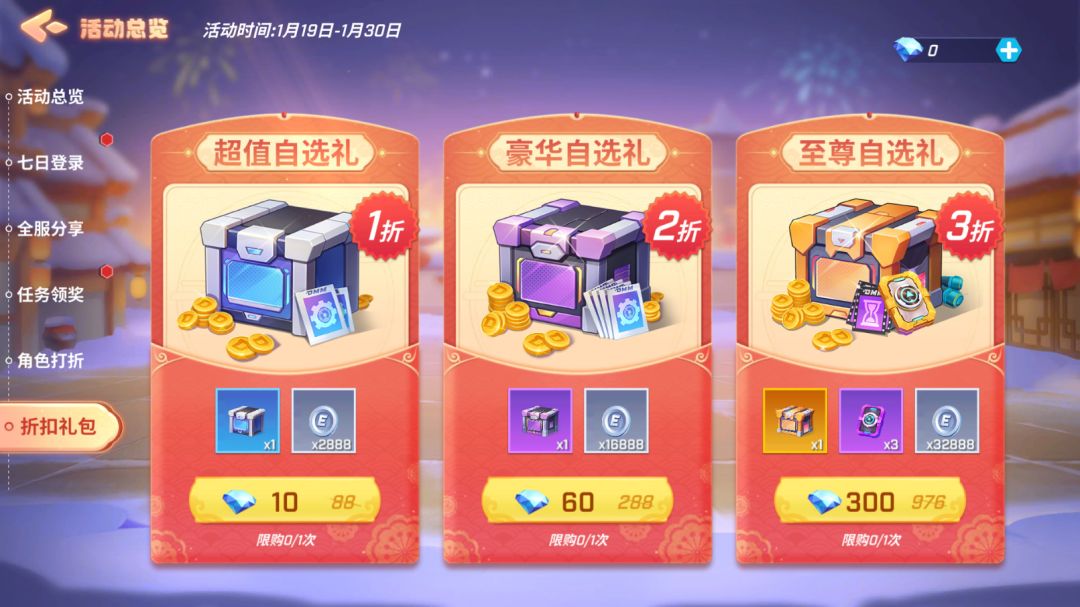 3折至尊自选礼:传说幸运卡*10 / 时光加速券*36 / 记忆金币*36 / 赛季胶卷*36 / 灵感胶囊*6 / 耀金卡包*1 / 点券*3688 (七选一)+ 暗紫卡包*3 + 白金币*32888