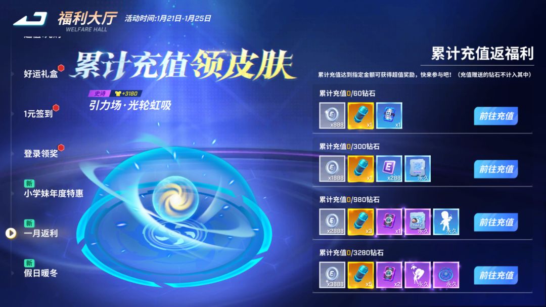 活动期间,累计充值达一定额度可获得永久道具卡皮肤【引力场·光轮虹吸】以及限定涂鸦、灵感胶囊、角色动作等丰富奖励!