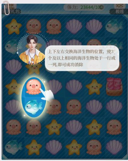 使3个及以上相同的海洋生物形成一行或一列,即可消除海洋生物。消除后可获得极地冰晶,连消次数越多冰晶加成越高。