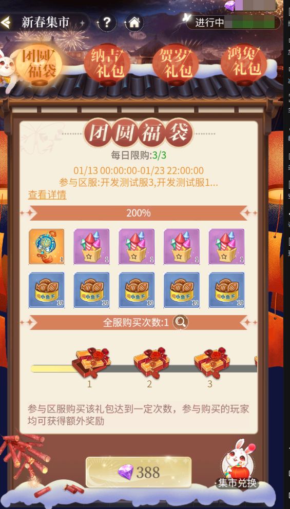 活动期间,三小姐可在新春集市界面购买新春礼包,购买礼包可获得活动道具【礼花】【祥兔结】【财神兔】,活动道具可用于集市兑换中兑换奖励。全服购买礼包累计达到一定次数后,参与购买的玩家可领取次数奖励。