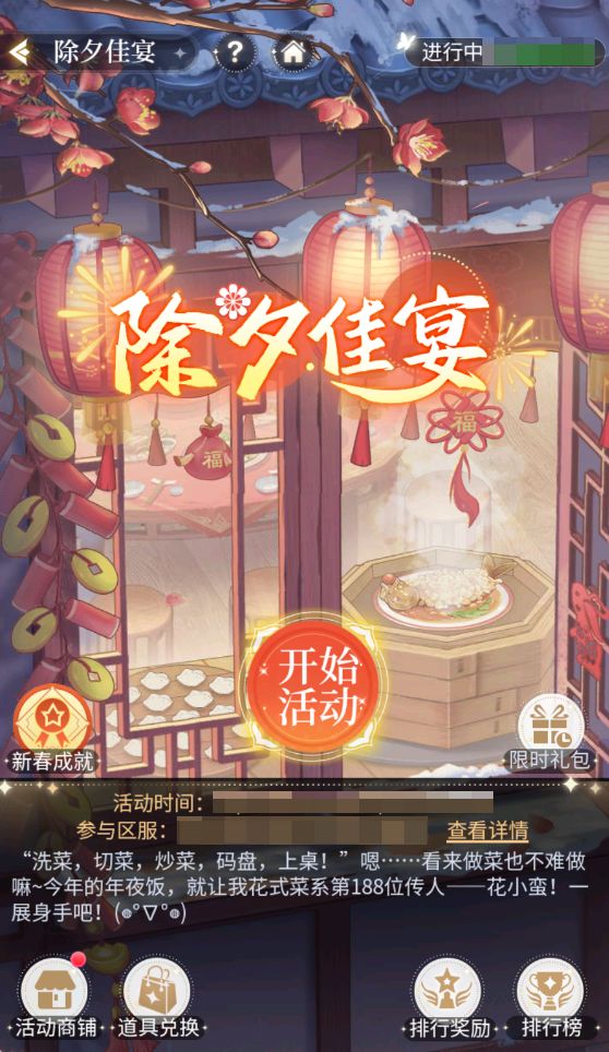 同一跨服组内共享一个烹饪进度,跨服组内累计获得的烹饪积分可解锁菜品,解锁菜品可获得佳肴值,跨服组内获得的佳肴值可领取新春成就奖励。