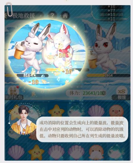 消除海洋生物可生成能量,能量可以减少场上被救助动物的饥饿值,被救助动物只能收到对应列的能量,被救助动物成功收到能量时,根据收到能量的次数会获得额外的极地冰晶奖励。