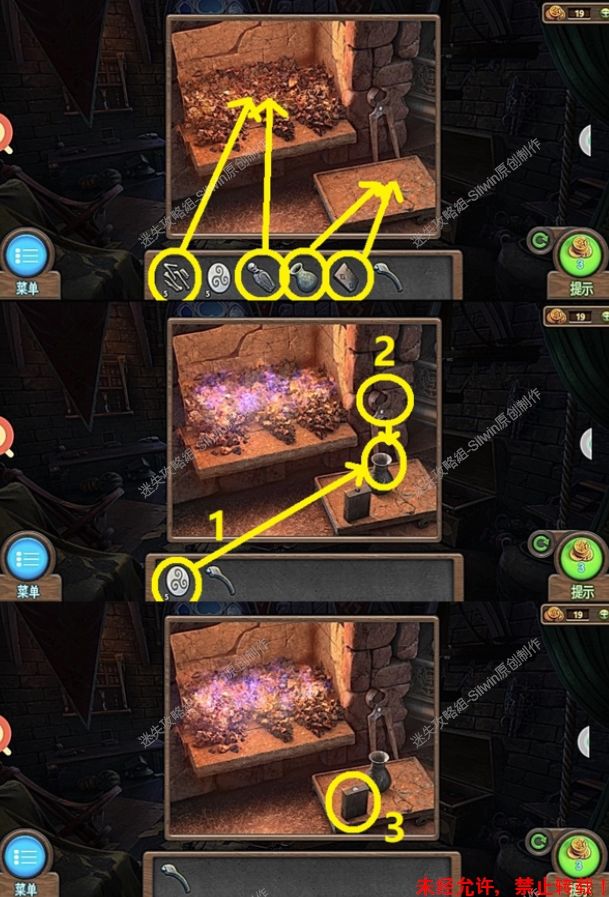 89.回到小屋调查火炉。向火中投入骨头(5/5)和吸血鬼的骨灰。在砧板上放置陶罐和钥匙的模具,陶罐中放入银币(5/5)。用钳子夹取陶罐,在火上熔化银,倒入钥匙的模具。打开模具,获得魔法钥匙。89-1、89-2、89-3