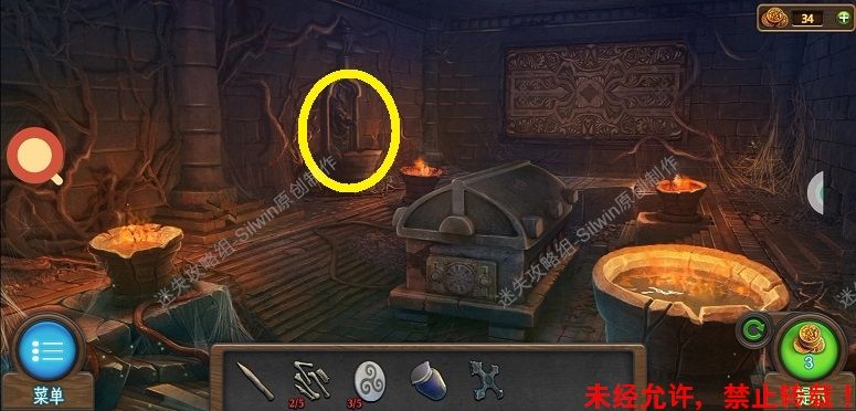 75.调查棺材上方,用酸液腐蚀链条,得到链条。调查左侧柱子底部,拿到磁铁。用斧子撬起石头,得到银币(3/5)。75-1、75-2