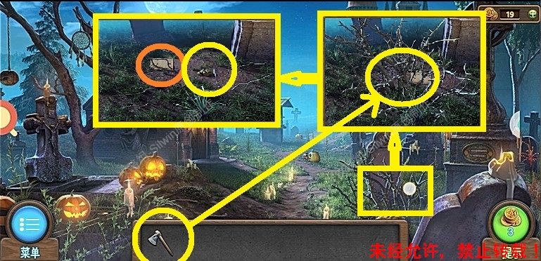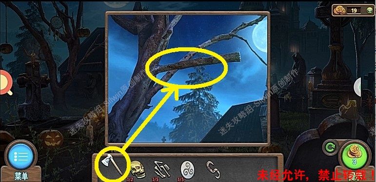 65.调查左侧的坟墓,捡起骨头(1/5),用斧子撬起石板,拿到银币(1/5)。65