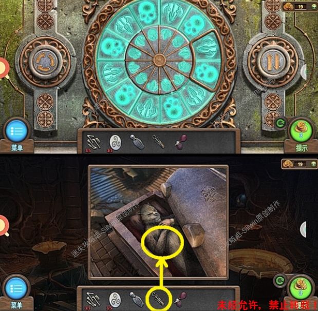83.回到墓室,调查棺材前的面板,放置两个按钮。按照里圈的图示排列外圈图案(两种图案间隔排列)。打开棺材,用注射器吸取狼人的血。83-1、83-2、83-3、83-4