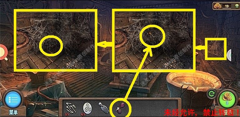81.到墓室调查里侧的墙壁,嵌入徽章。转动圆圈复原图案。最终效果如图。进入隧道,攀上楼梯,进入小屋。81-1、81-2、81-3