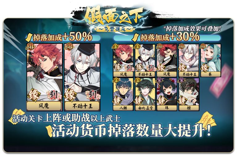 1.上阵或助战以上武士挑战活动关卡时【刀印护符】的掉落增加(效果可叠加):