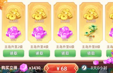 一本万利,成长回馈,有能力的岛主强力推荐可以考虑购买,此活动会随着主岛等级提升解锁10超值返利,购买后永久有效,总计获得24500金币、2120紫晶和945如意,是相当的划算,此活动是的限时活动,过了就没有了,建议有能力的岛主一定要购买。解锁等级分别为主岛2级、4级、6级、8级、10级、12级、14级、16级、18级、20级、22级、24级、26级,达到相应的等级即可获得相应等级的奖励。