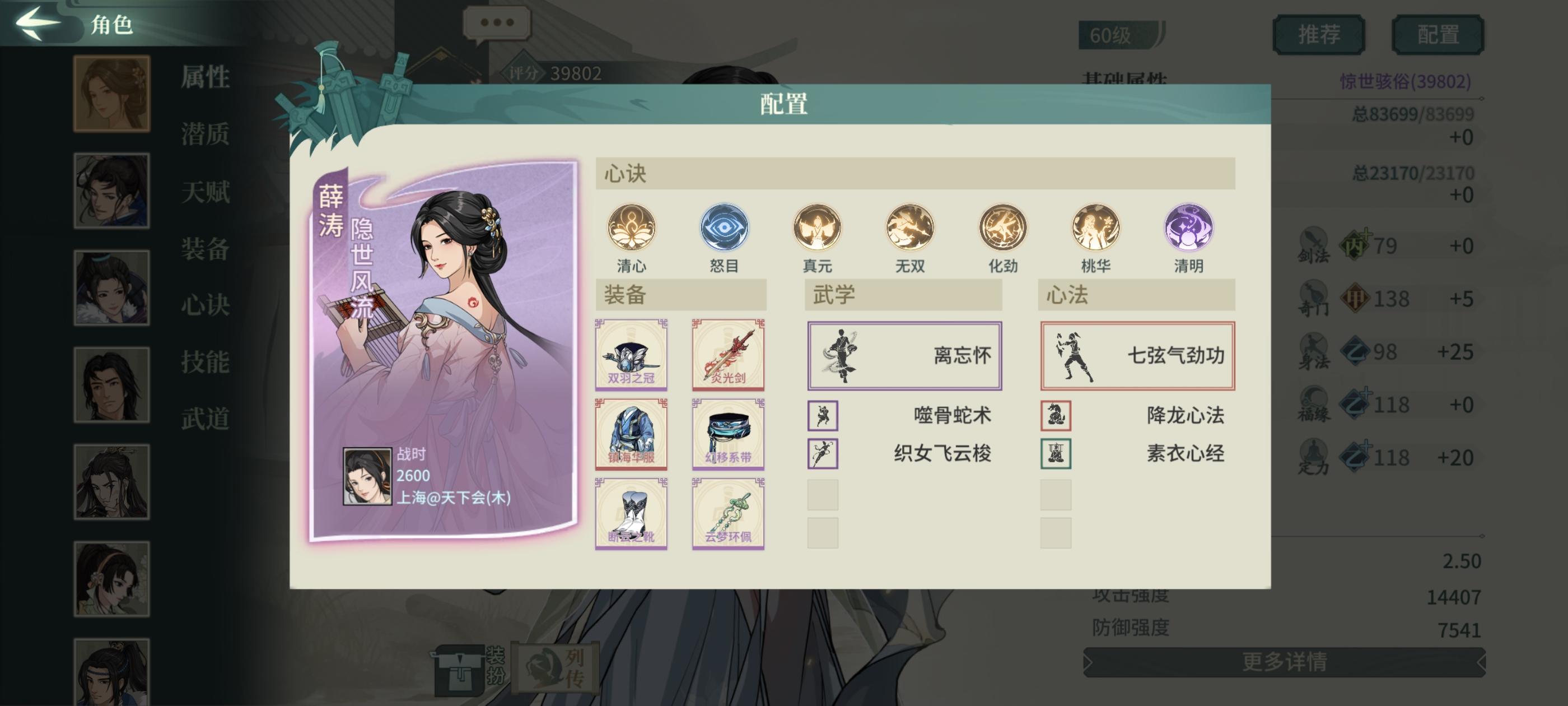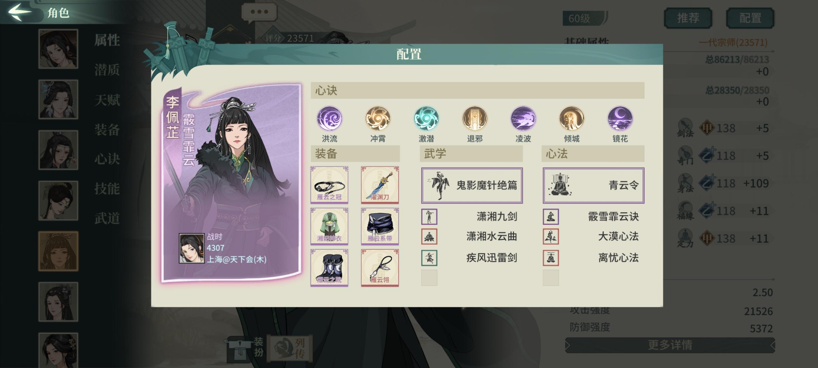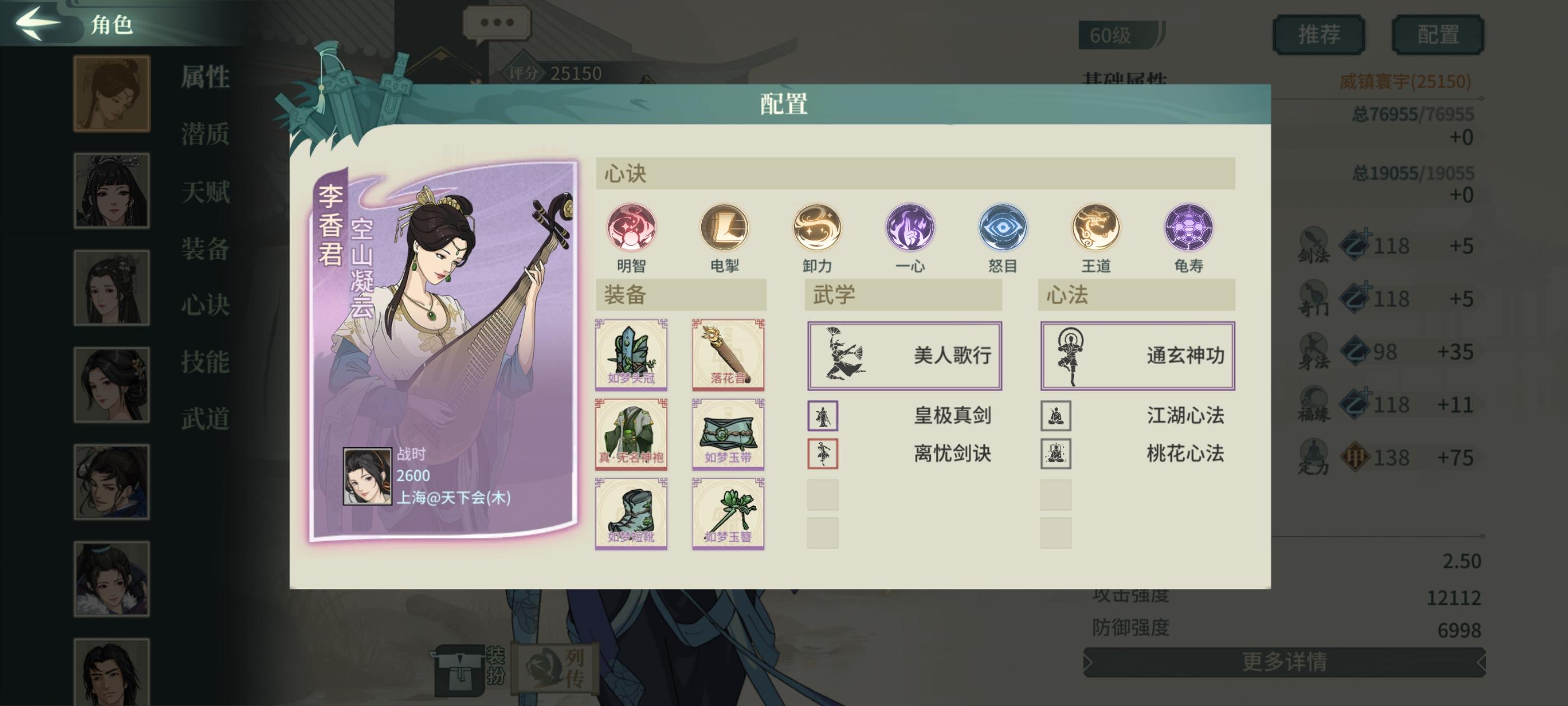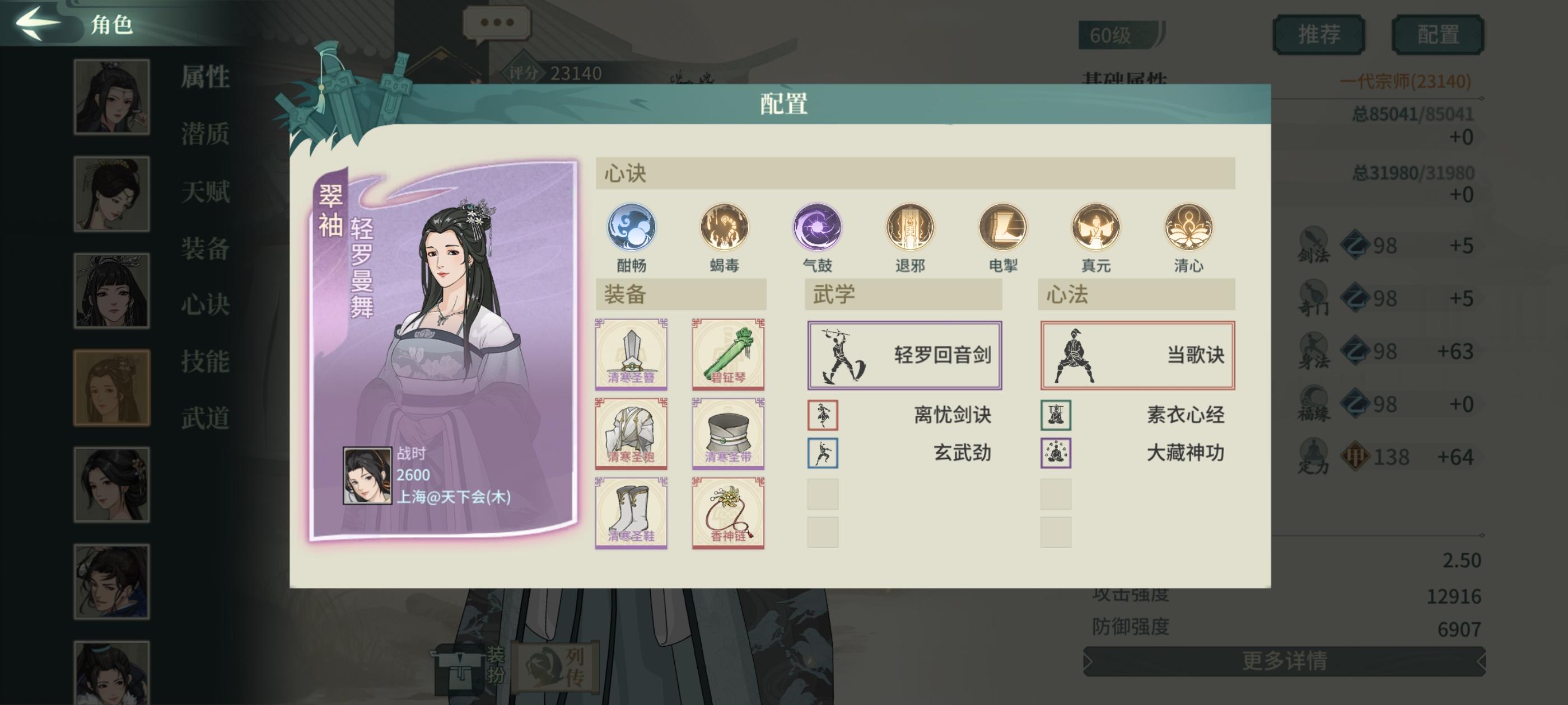 伟大的岳母大人,00可用,武学最好三突,碎玉换激潜即可。自己试了下锤子比太极拳更好用,灵憩套和高额真伤绝配,青莲剑佩增加反击率,破风提升对面孤立概率,摧魄神爪提升负穿和回怒效率,因为基本和师姐或薛涛绑定,所以没有给回内。装备洗练双身法,技能顺序4内321。(青莲剑佩是主角饰品下级装备,萌新只能通过开装备箱子得到,没有可以换成神秘鬼画符提升生存能力)