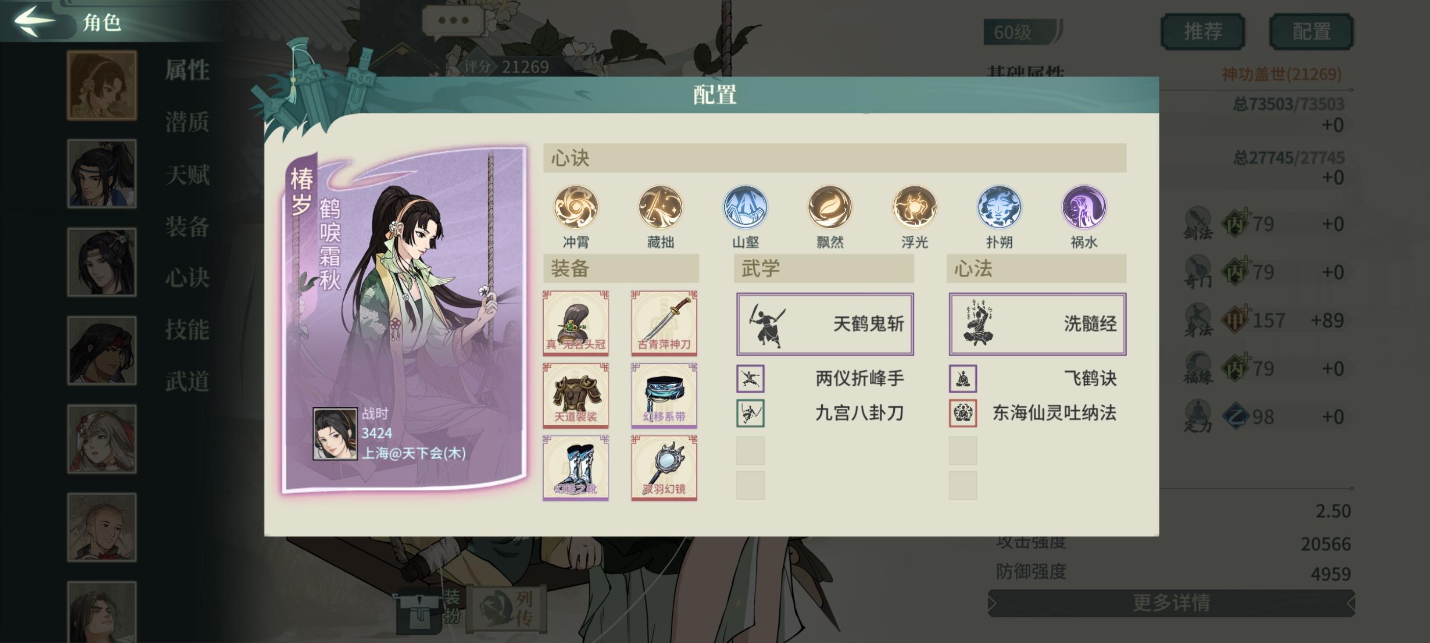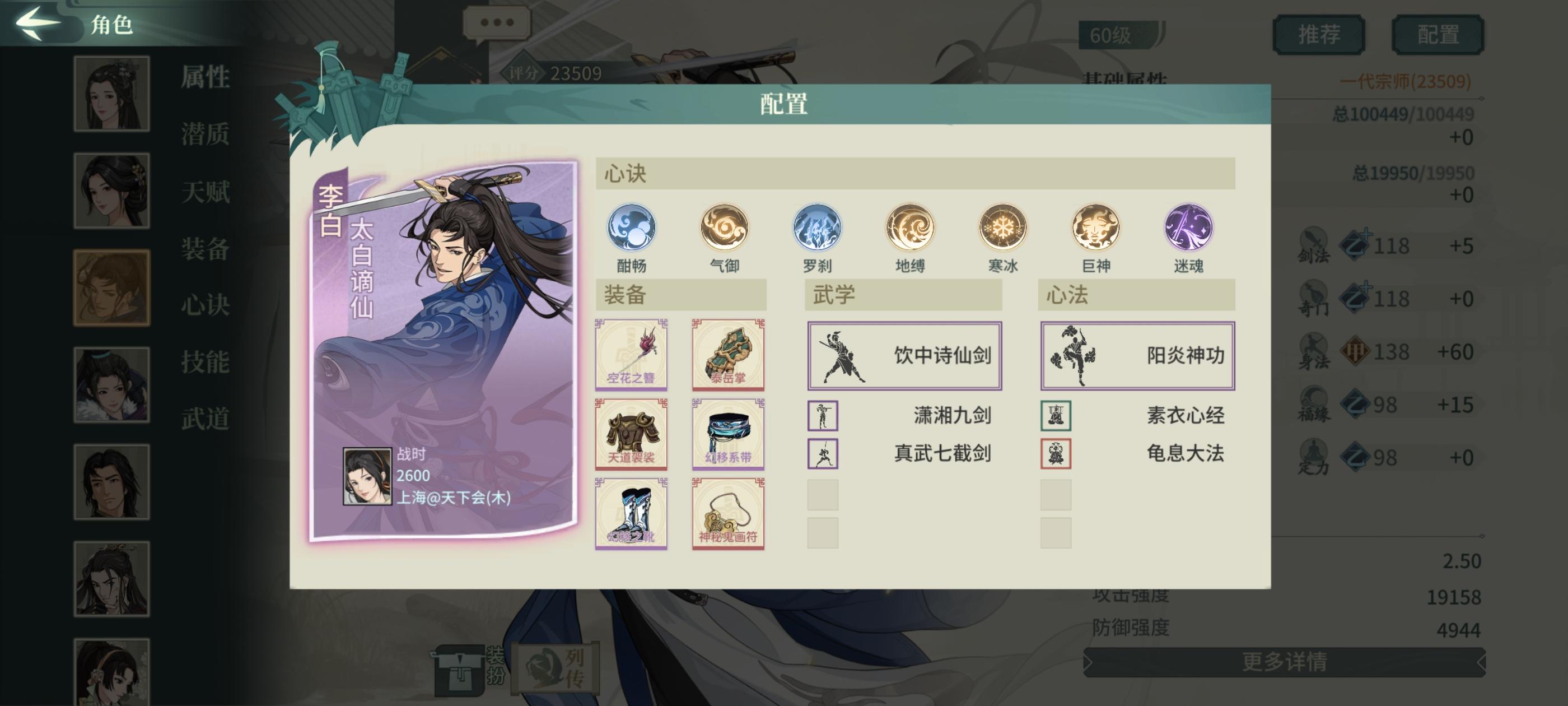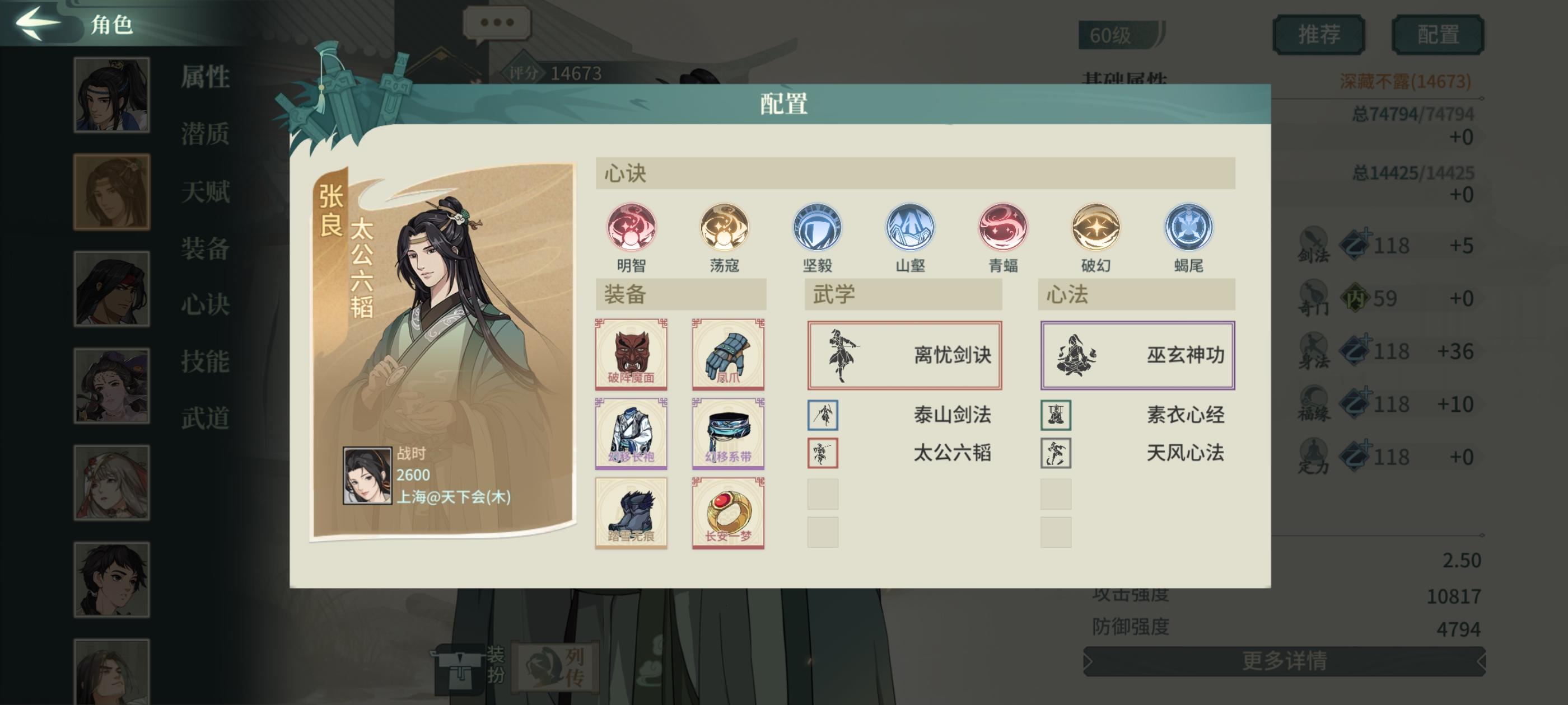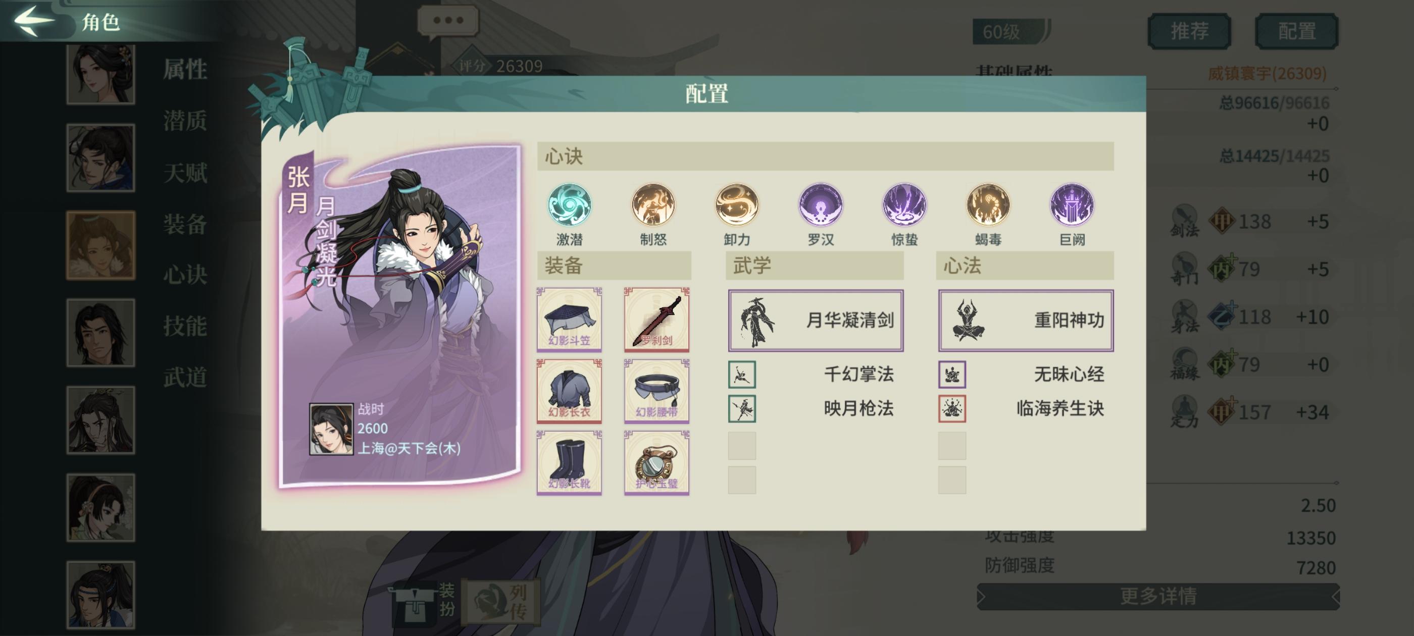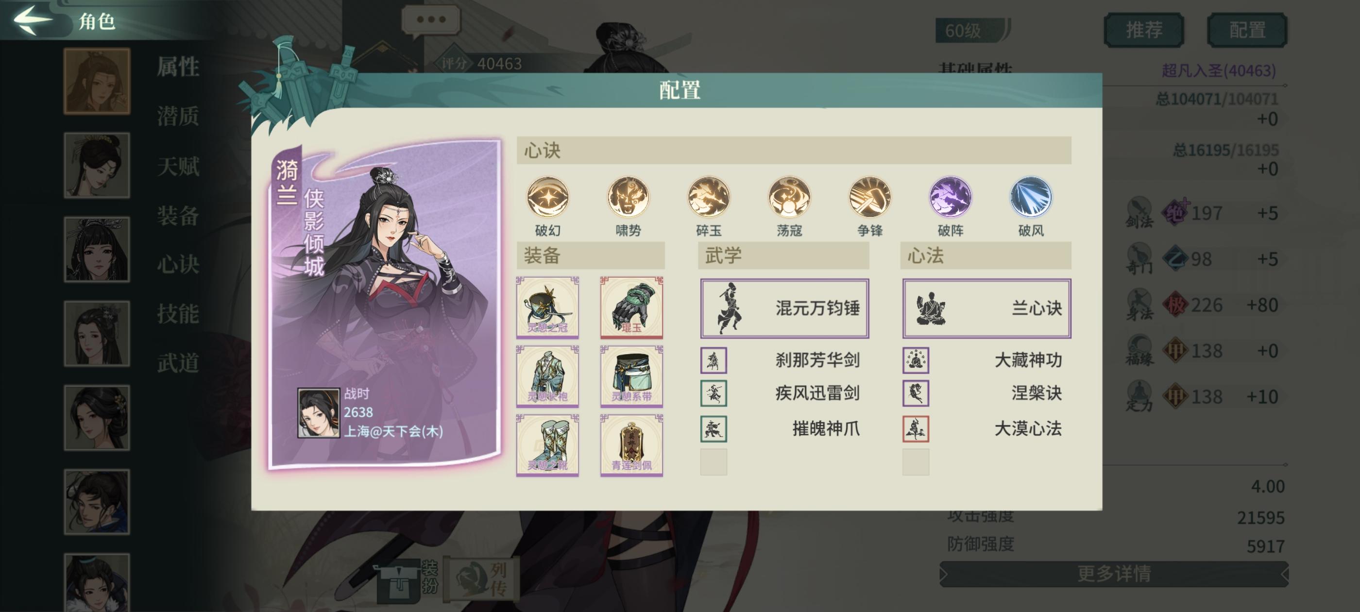 伟大的岳母大人,00可用,武学最好三突,碎玉换激潜即可。自己试了下锤子比太极拳更好用,灵憩套和高额真伤绝配,青莲剑佩增加反击率,破风提升对面孤立概率,摧魄神爪提升负穿和回怒效率,因为基本和师姐或薛涛绑定,所以没有给回内。装备洗练双身法,技能顺序4内321。(青莲剑佩是主角饰品下级装备,萌新只能通过开装备箱子得到,没有可以换成神秘鬼画符提升生存能力)
