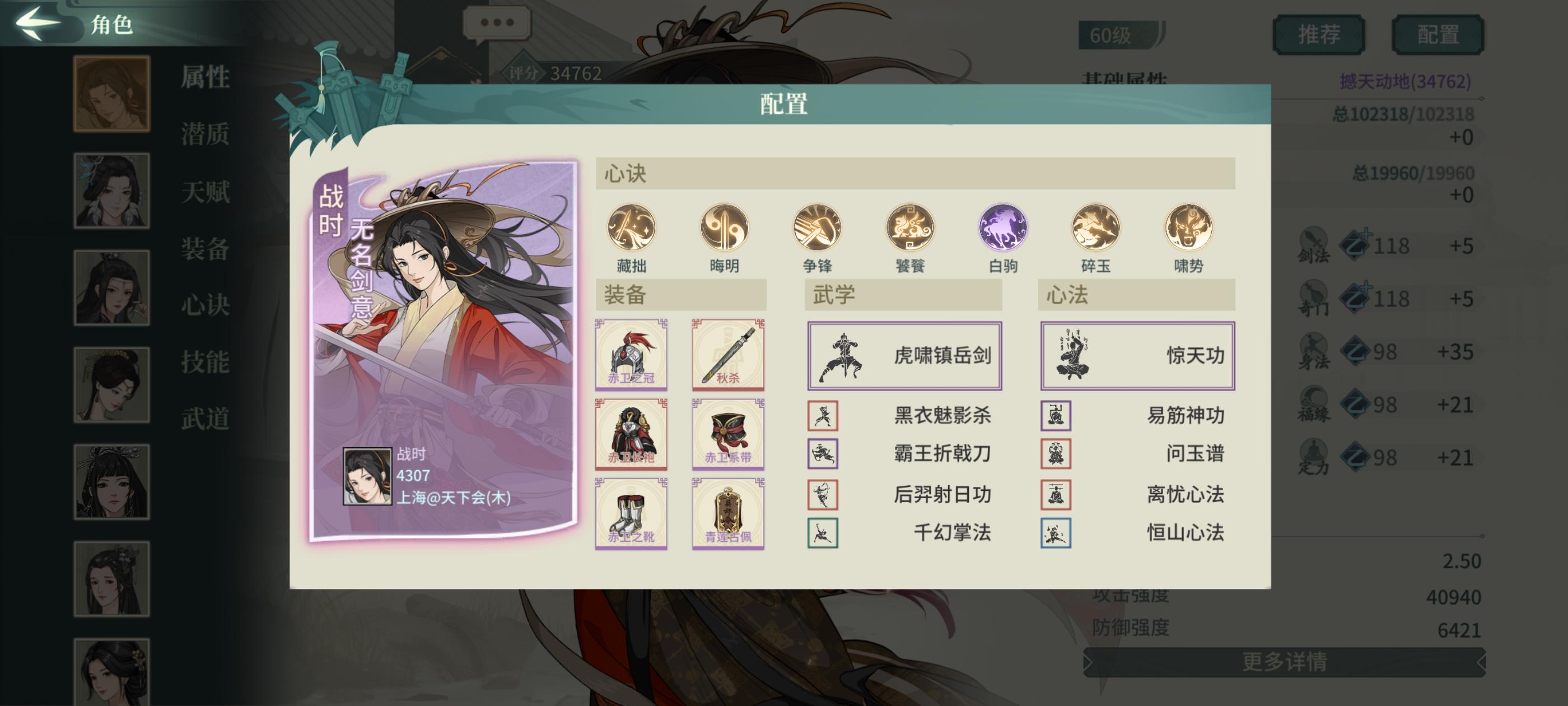 常规恒山剑意主角,帮猪没有抽吞锋诀,只能用霸王刀替代,打幻影多的阵容效果也还行。武道选择剑意激荡、心意通达,装备洗练双臂力,技能顺序4321内。