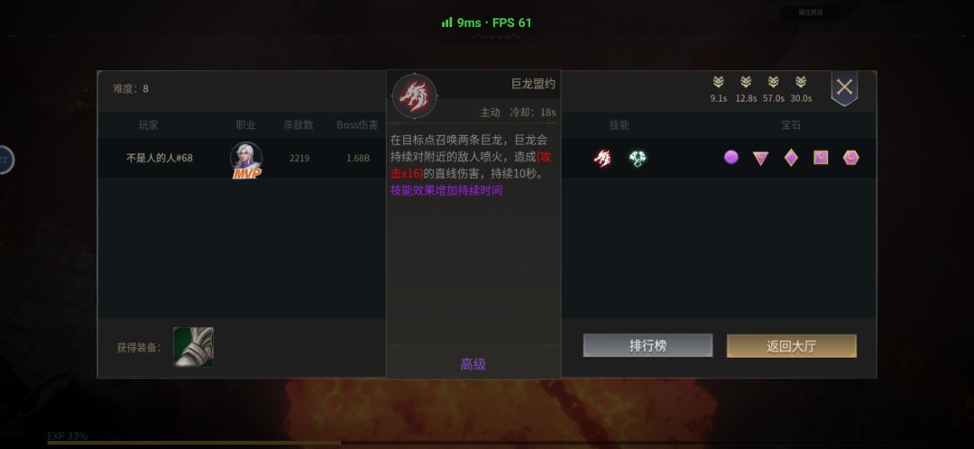 首先核心技能,巨龙契约(主要伤害技能/紫色的技能,攻击乘以16下还是很可观的)