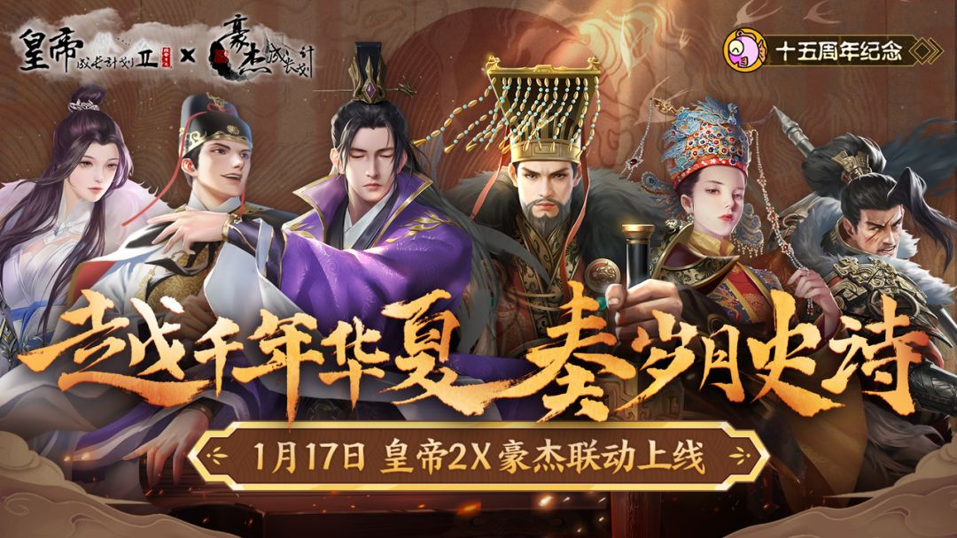 比目鱼十五周年纪念,《皇帝2》x《豪杰》联动定档,1月17日正式上线! ◇ 越千年华夏,奏岁月史诗...