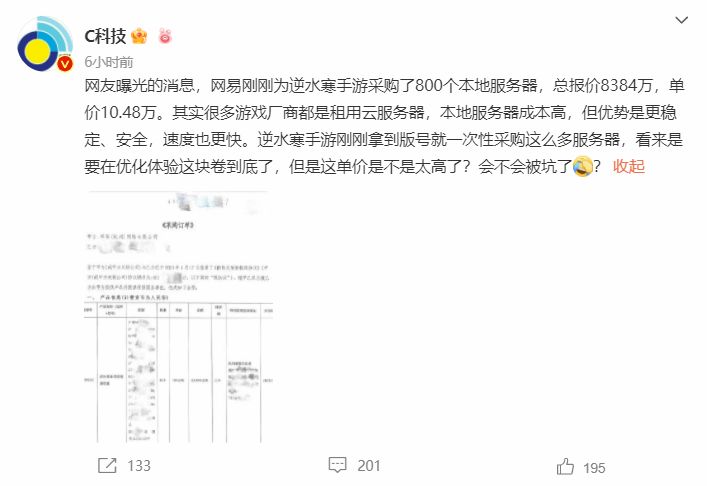 近期,网络上有知情人士曝光了网易的采购订单。订单内容显示,网易为《逆水寒》手游定制了800个本地服务器,总报价达8384万,单价10.48万。