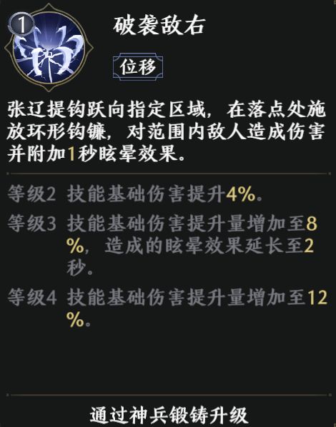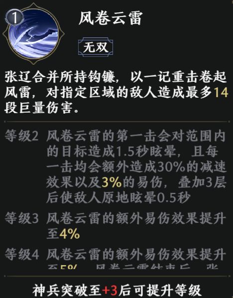 该技能升级至3级后,造成的眩晕效果延长至2秒,能进一步提升张辽的控制能力。