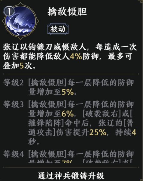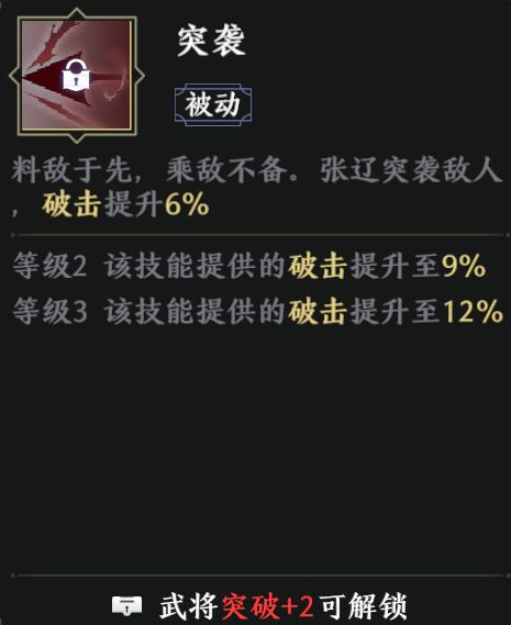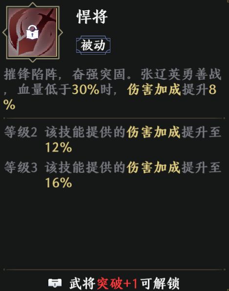 张辽突破加1时解锁。当张辽血量低于30%时,提供一定的伤害加成。增加了张辽在劣势情况下的攻击能力。