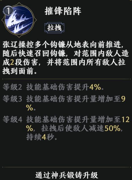 【摧锋陷阵】提升至4级后,拉拽后使敌人减速50%,持续4秒。这能让张辽拥有更强的黏人能力,是相当不错的提升。