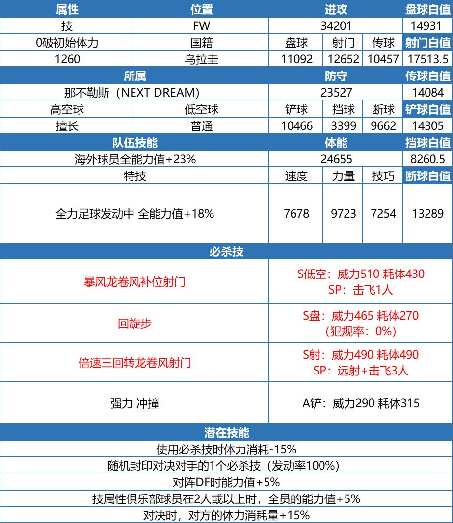 爆气状态拥有非常强的地面和空中射门能力,盘球能力也是顶级,爆气盘球有很不错的强吃能力;爆气时低空威力可优势月中若琳;