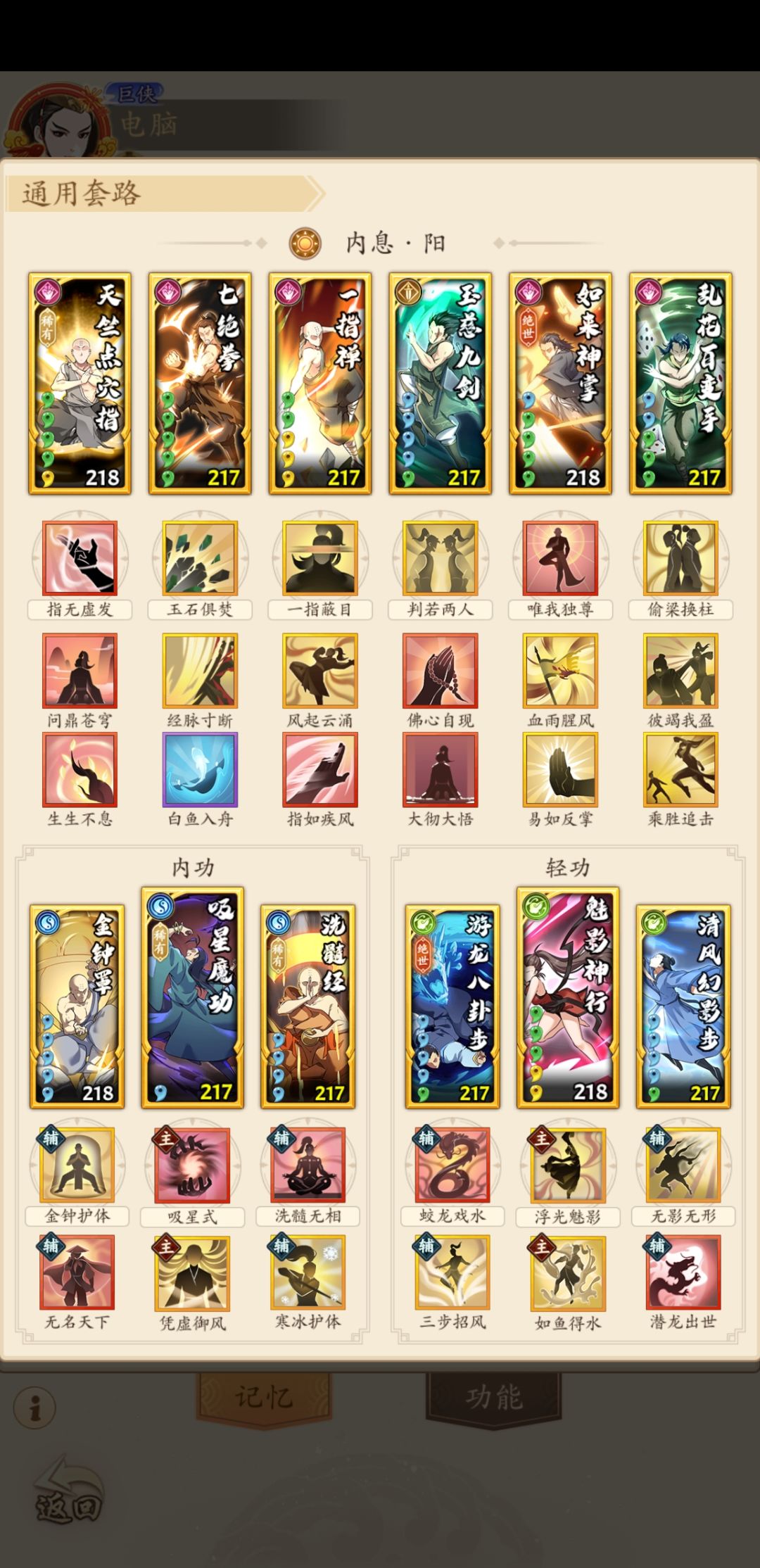 阴拳也是同样的思路,只不过把内息改成阴,唯一的几个区别是,阴拳可以带吞月之息,配合问鼎打高连击,连击对于吸内的价值上一篇已经说过了,这里不继续阐述了。其他配置基本和阳拳一样,还有一些不同就是带清风的情况下可以把潜龙省出来带一个迷踪佛影,化劲在打木人高暴击的情况下是非常有用的。