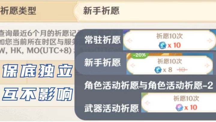 新手共有四个祈愿池,分别为新手祈愿、角色/武器活动祈愿、常驻祈愿。千万别为了省那-20%的相遇之缘去抽新手祈愿,因为你可能会损失不止一个金!每一个许愿池都有保底次数,且每一个池子保底次数单独计算,意思是你累计在一个池子抽取次数达到90次必定会给你出一个金,并且每一次抽取后会不断累积叠加出金的概率,直到出金后刷新;紫的保底为10次,跟金同理。将抽取新手祈愿花费的相遇之缘留给常驻祈愿。