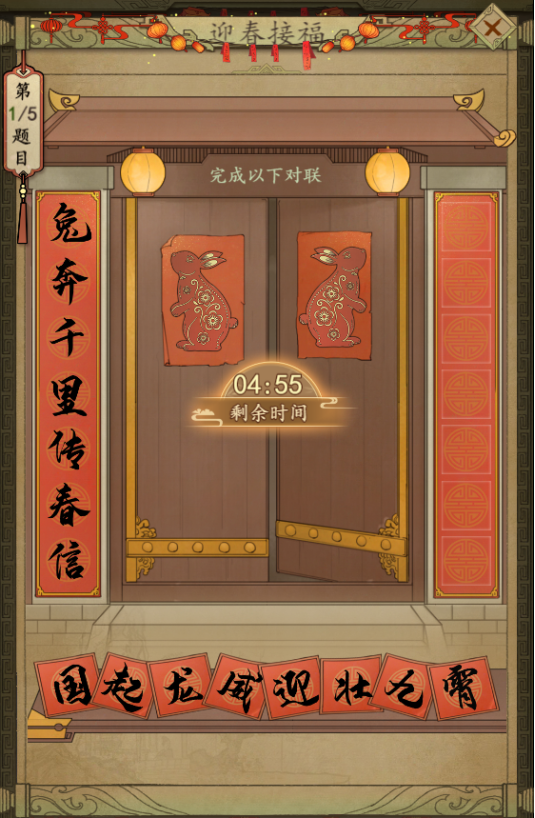 3.1、迎春接福:系统随机出现一副春联的上联,从界面下方的文字中拖入相对应的下联既为完成,有一个错别干扰的文字,每关总共5副对联,在倒计时结束前全部正确即可通关可前往新春试炼界面领取该主题的通关奖励。