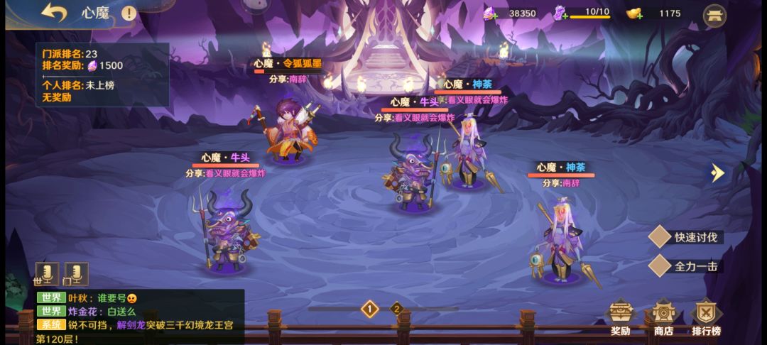 通过挑战副本随机刷出心魔,而心魔分为三种,且可与公会共享,第一种是最脆的“神荼”,第二种是相对来说肉一点的“牛头”,第三种则是比较难打的橙色心魔,需要和公会的小伙伴一起攻克,前期来说光靠自己还是比较费力的。