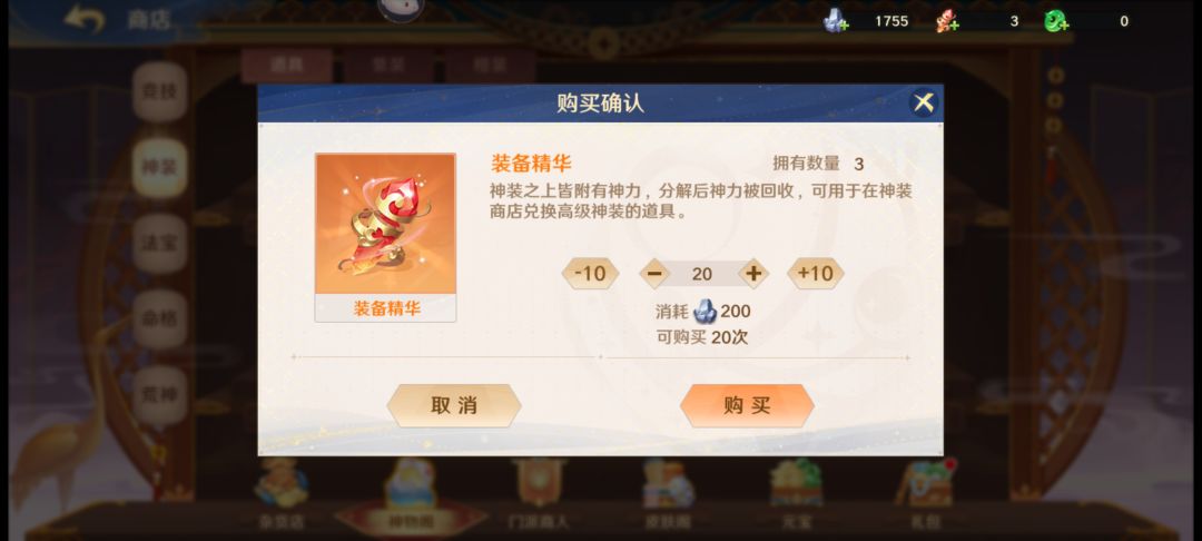 玩法主要是强化石以及装备材料的获取,达到一定层数后也会过得少量的元宝,其中最重要的是玄铁的产出,在上文的“方寸画卷”中也会产出部分玄铁,玄铁可用于在商城中兑换装备精炼石和装备精华等。装备精华为该玩法最重要的核心产物,用于兑换装备碎片,但不得不说产出量还是太少,并且每天只能通过玄铁够兑换20个装备精华,其余的装备精华只能通过幻境爬塔来获取。