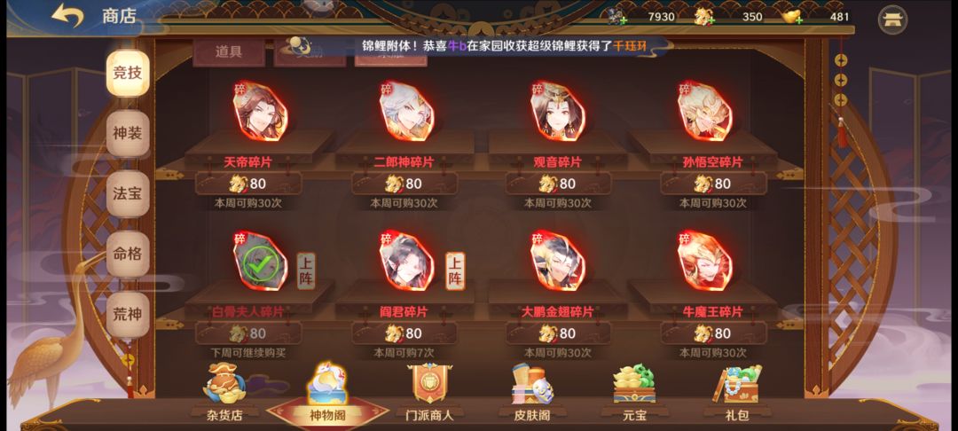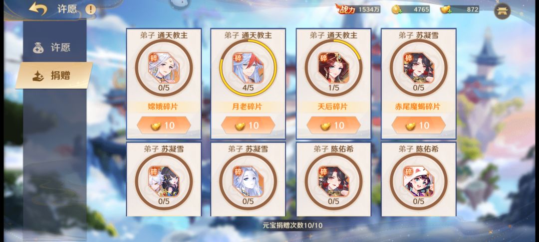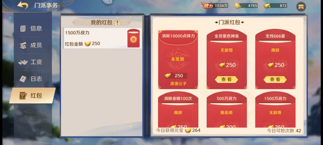 除此之外门派还有许愿功能和红包功能,达到一定要求后可以在门派频道发放红包,同时也可以共享别人的红包。许愿功能可以每天选择3位神将,通过门派内免费捐赠的方式获得角色碎片,但人如果太多了会导致靠后的人拿不到碎片,个人觉得这个功能还是需要改进一下。