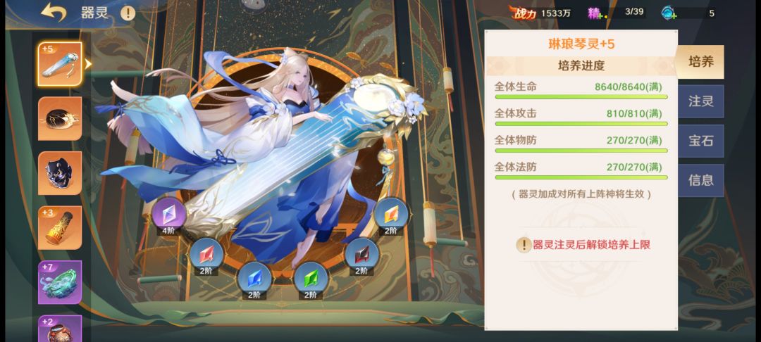 由于两个板块是密切相关的,所以放在一起说了。蓬莱的主要产出物为宝石以及宝石碎片,均可镶嵌在器灵身上,获得额外的属性加成,而碎片也可以用于对镶嵌宝石的升阶,对碎片升级也可以让碎片升阶为宝石,宝石阶级越高,所给予的属性加成就越高。