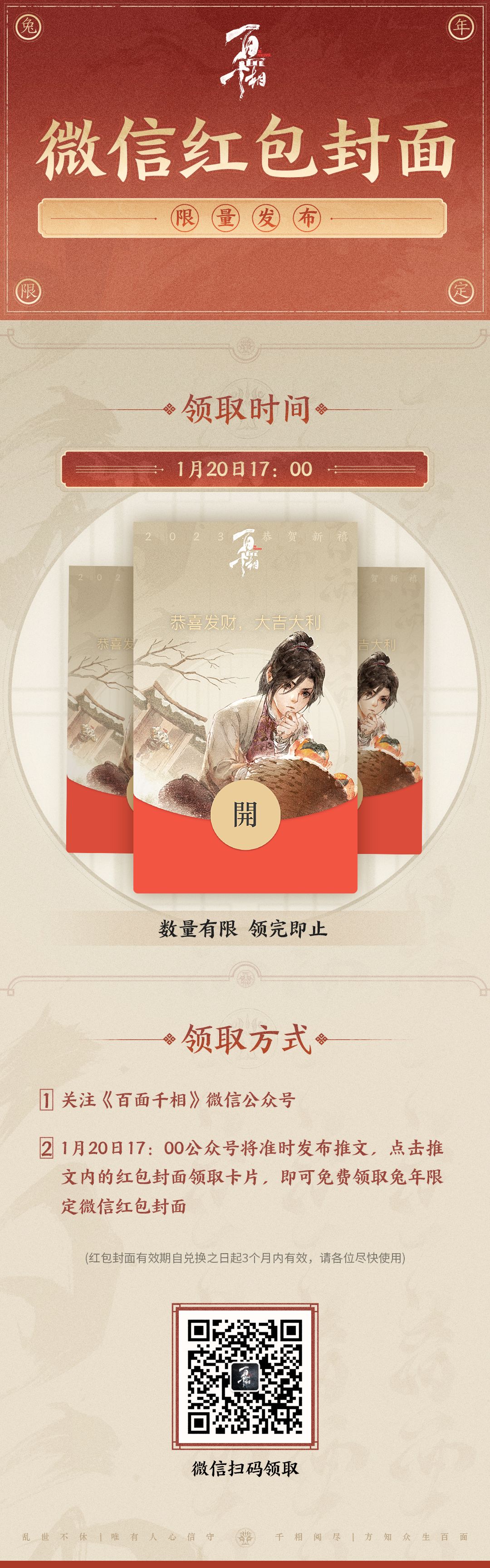 新春佳节将至,我们为各位特别准备了《百面千相》春节限定微信红包封面,领取攻略如下: