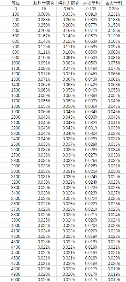 举例来说,脑科学研究100级时,该研究的实际效果是使得研究效率变为(1+0.01*100)=2.00倍,而提升一级之后的研究效率为(1+0.01*101)=2.01倍,也就是说,提升一级导致整体研究效率提升了2.01/2.00=0.5%。