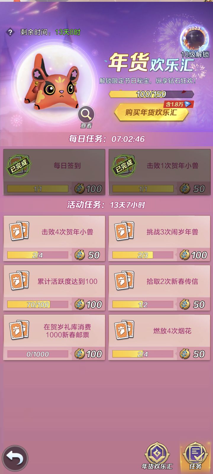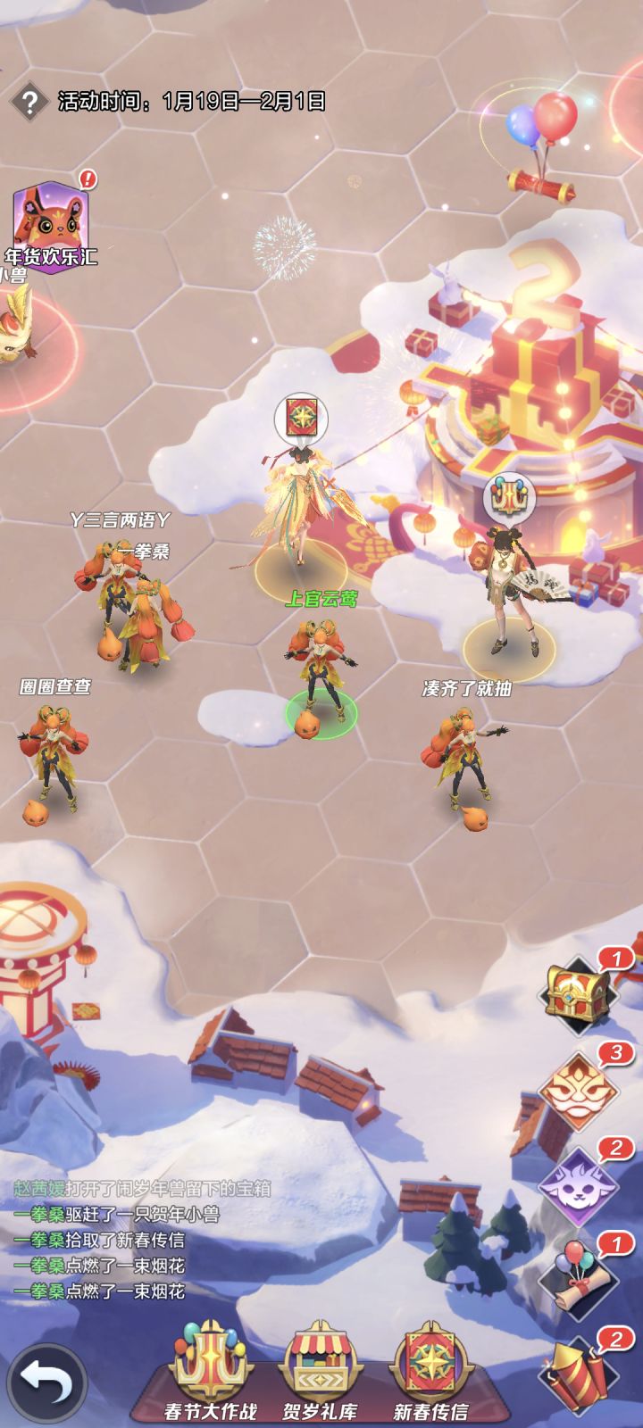 右下角竖着的5个图标依次点就行:①打大年兽,不花钻石 ②打小年兽 ③放鞭炮 ④捡信封;⑤左下角“春节大作战”点古古每日签到 ⑥左上角“年货欢乐汇”--交任务