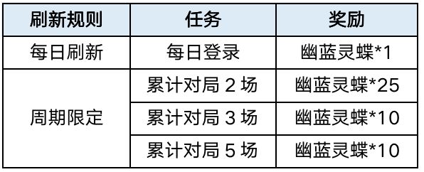 2、完成任务或者购买礼包收集【幽蓝灵蝶】,使用【幽蓝灵蝶】可兑换皮肤残影·斩妖御魔行、美杜莎·末日邪眼、刘备·崩坏之源、露西亚·堕落天使、穆桂英·音速狂飙、杨戬·深渊之眼、貂蝉·超音速刃、李清照·日月祥云、刘备·朋克绅士、赛季英雄自选箱、自建赛门票等超值好礼!
