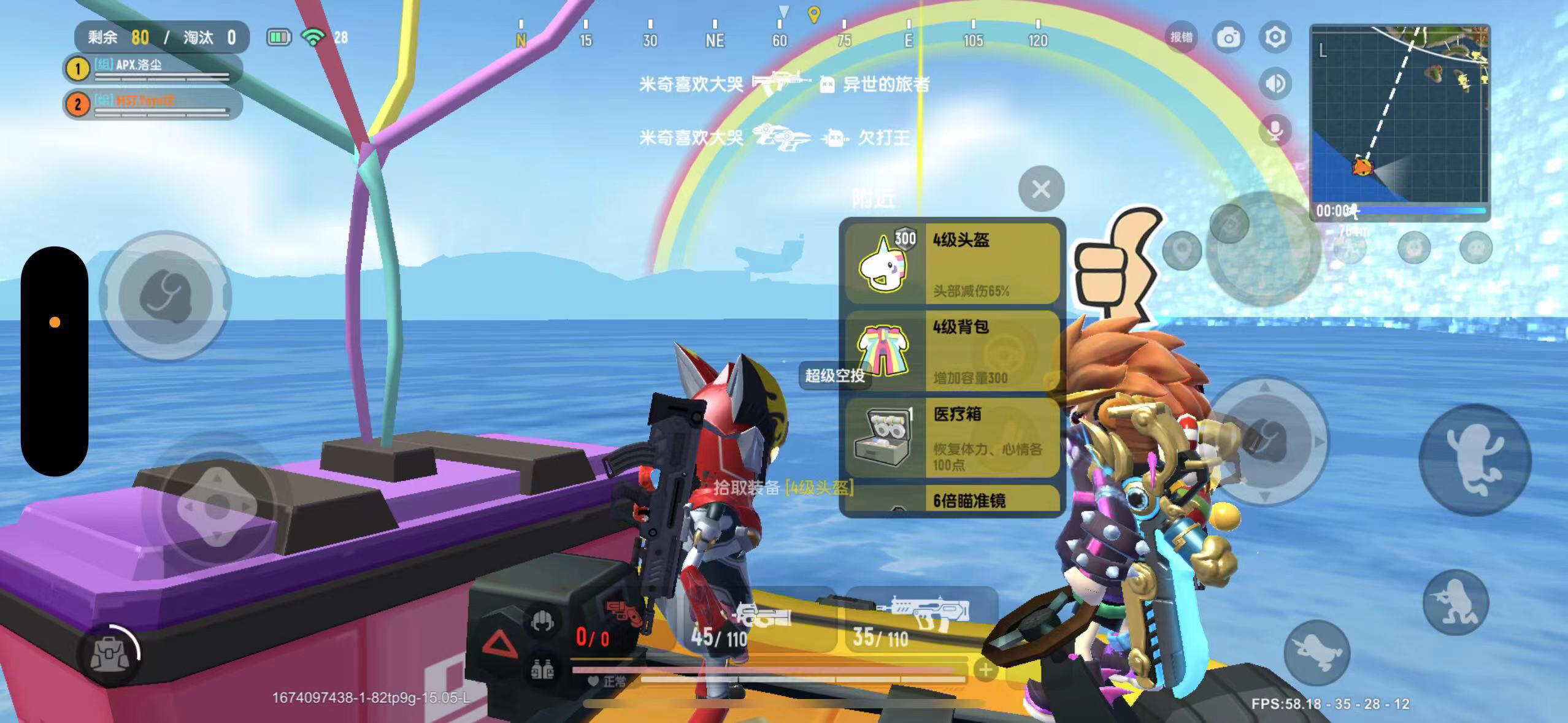 《我和师傅的快乐瞬间》今天我柯南加了我,成为了我的师傅。玩了几把,捡到了2把信号枪。去海上打了,第二次见到后差点被打,还好最后敌人被击退了。靠着师傅的办法,我今天加了20几分。这样看来,我这个赛季上巅峰一星还有希望。柯南也是好久没见了,我都不知道他改名了呢!!! 这个超级空投里的武器是一把AUG,和一把RPG。我拿了一把AUG,师傅拿了一把RPG。
