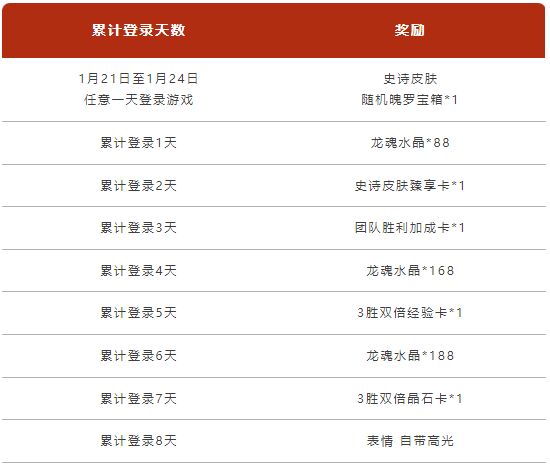 除此之外,从明天开始,截止至1月27日,召唤师只要累计登录天数,还可以免费领取史诗皮肤臻享卡、表情、龙魂水晶等惊喜奖励~