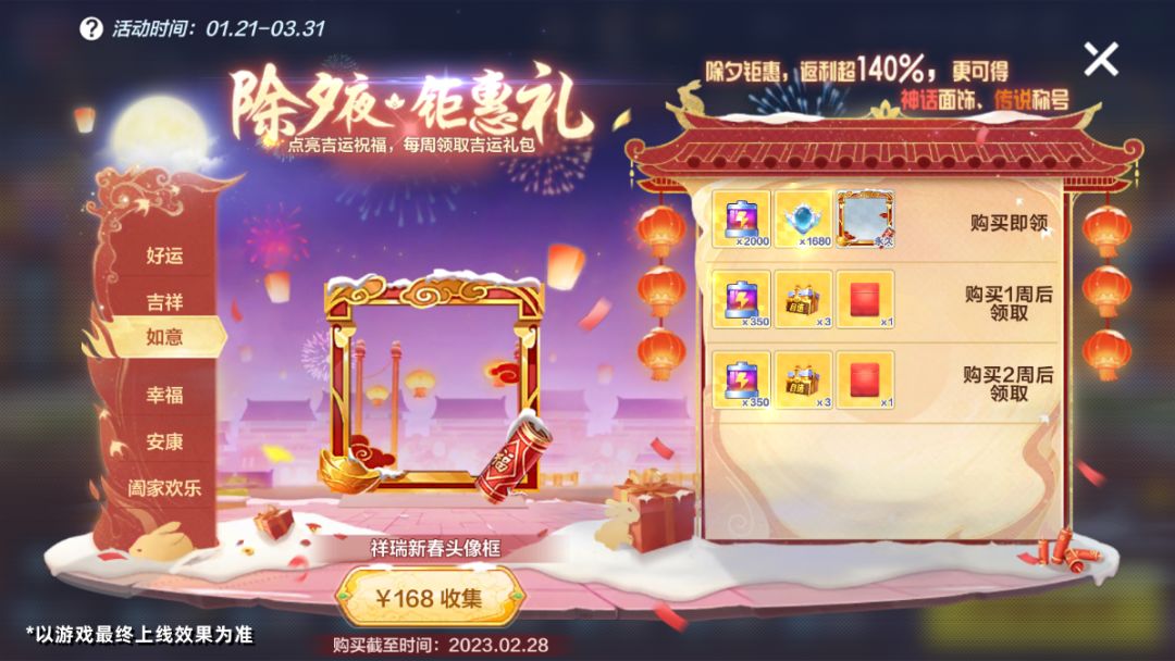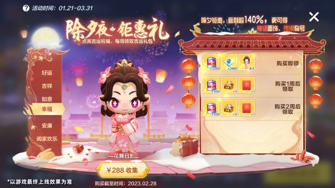 1月21日-3月31日,游戏内开启【除夕钜惠】理财活动,车友们可以在活动有效期内,使用直购的方式购买不同档位的吉运礼包,每购买1个礼包可点亮礼包对应的吉运祝福,购买后可立即领取相应的吉运礼包,待到达时间后可领取下一个吉运礼包,直至领取全部礼包(每种吉运礼包总计可领取3次)。点亮全部吉运祝福后即可获得吉运大奖——永久神话面饰【日月同辉面饰】、高概率防御火球炸弹的【浴火龙骑称号】*180天!活动期间,每种礼包只能购买1次,不可重复购买,购买截止时间为2023年2月28日。