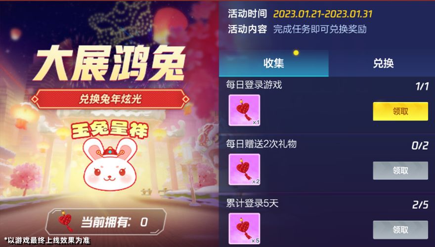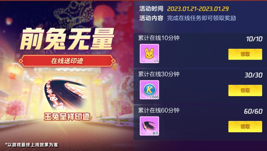 完美漂移,称心如意,“兔”个吉利~1月21日-1月29日,活动中心将开启【前兔无量】在线送印迹活动。活动期间车友们累计在线时间达到指定要求,即可领取玉兔呈祥印迹!