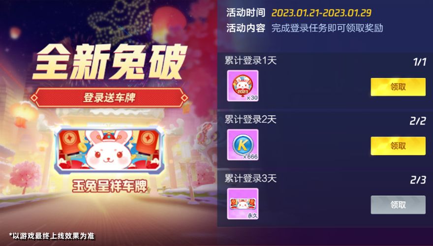“兔”飞猛进,赢在开年~1月21日-1月29日,活动中心将开启【全新兔破】登录送车牌活动。活动期间车友们累计登录3天,即可领取玉兔呈祥车牌!