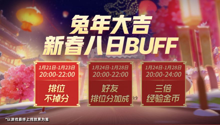 1月21日-1月28日,繁荣山丘将开启【兔年大吉】新春八日BUFF。排位不掉分、好友排位加分、三倍经验金币等众多游戏BUFF等你参与!繁荣山丘迎新春,欢欢喜喜过大年~