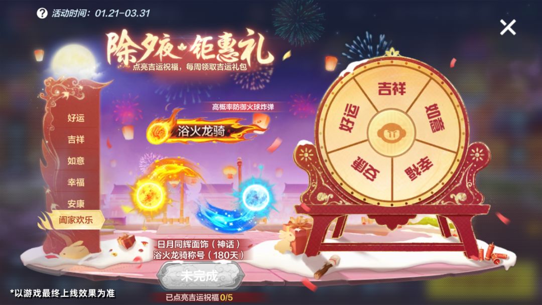 点亮全部祝福后即可获得吉运大奖——永久神话面饰【日月同辉面饰】、高概率防御火球炸弹的【浴火龙骑称号】*180天!