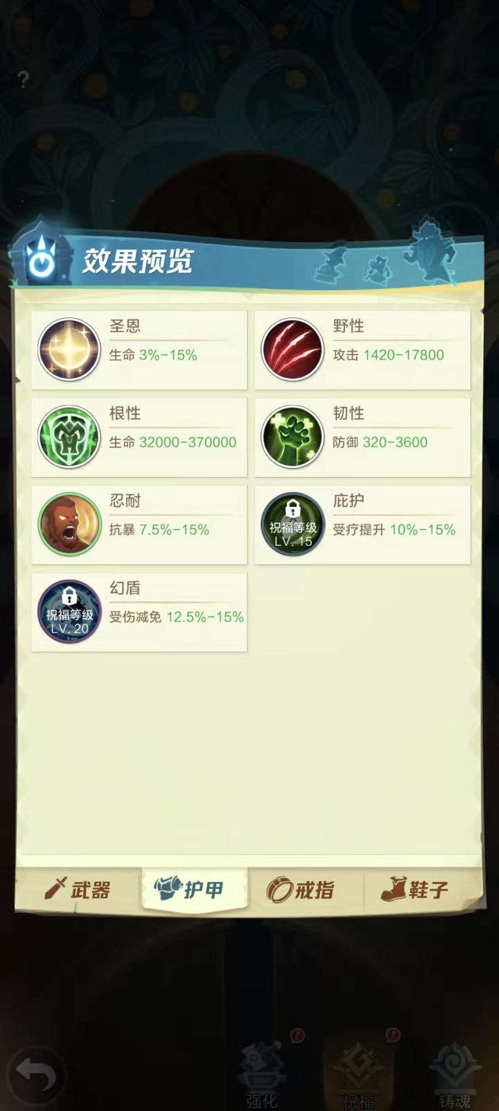②祝福:每祝福一次出现随机效果并升级1点EXP,EXP条满了升级祝福等级,lv1-5要100尘祝福一次,5-10要150,10-15要200;刷一个lv15大概20万粉尘左右。可在右上角小放大镜查看祝福效果。