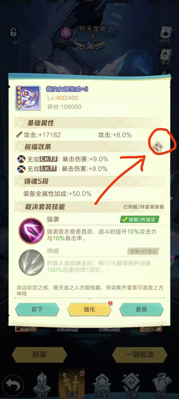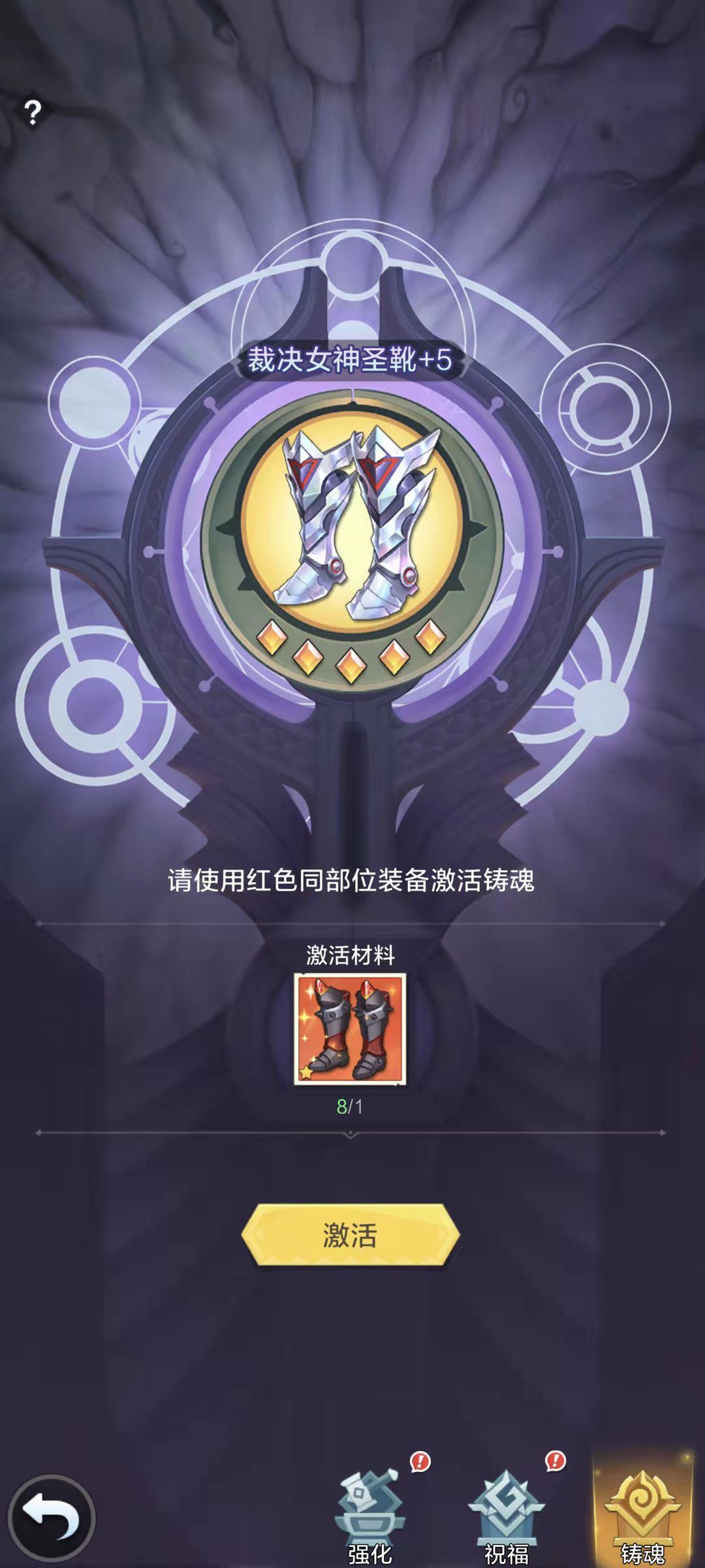 ③铸魂:普通装备的最终归宿。可以铸魂5次,消耗红色装备1-5星,每次加10%所有装备属性,先给主c的铸魂,提升非常明显,30速度变45速度,4个新英雄也可以变成200霍德尔战灵碎片